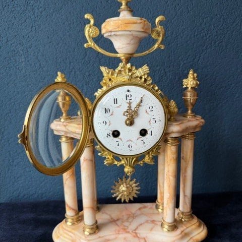 Portikusklokke i hvid marmor og forgyldt bronze, Louis XVI-stil, anslået periode 1790, mekanisk urværk med 8 dages gangreserve, højde 50 cm, vægt 6 kg, i god stand og i gang. Klik på den blå "gå til varen" knap, for at købe eller byde på denne vare. Den samlede pris vil blive vist inden du afgiver dit bud.