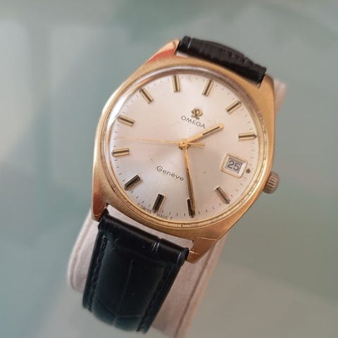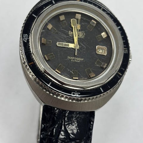 Eberhard & Co Contodat Chronograph, referencen 14900, manuel udrift, urværk Eberhard 310-82, guldbelagt kasse, 38 mm diameter, hvid skive, sort læderrem, ingen original æske eller papirer, produceret omkring 1960, i god brugt stand med synlige slidmærker, kronograf og dato. Klik på den blå "gå til varen" knap, for at købe eller byde på denne vare. Den samlede pris vil blive vist inden du afgiver dit bud.
