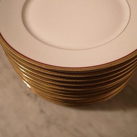Limogesporcelæn — eksportstudie-dekoration, ca. 1965–1975 — fuldt middagsservice til 12 (86 stk) — dobbelt sorte linjer med satin‑ og brillant gilding — schweizisk families provenance