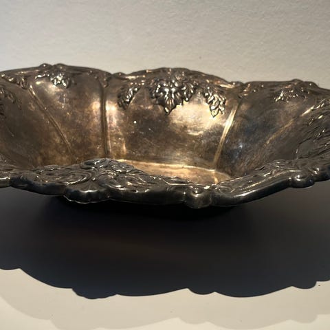 Sølvtøj, Sølvfad, Fint, gammelt sølvfad (plet) af dansk oprindelse - med blomstermotiv i midten. Diameter 30 cm. Højde 3,6 cm