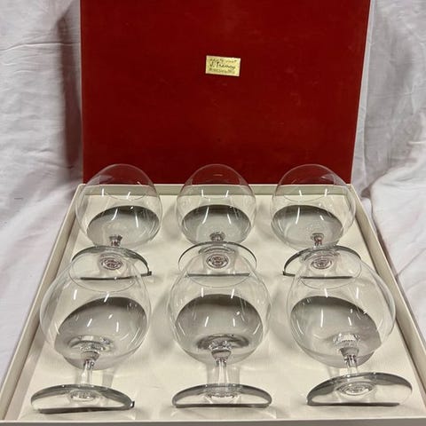 Sæt af 6 Baccarat Vega krystalglas med base underskrevet Baccarat France, højde 23 cm og diameter 8 cm, i fremragende stand og aldrig brugt. Klik på den blå "gå til varen" knap, for at købe eller byde på denne vare. Den samlede pris vil blive vist inden du afgiver dit bud.