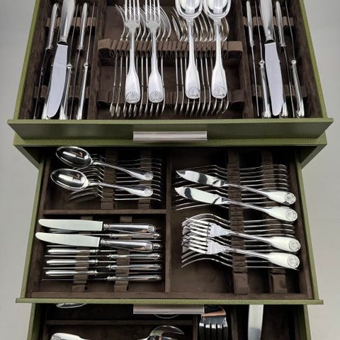 Two Atlas-saucebåde. Atlas-kollektionen blev designet af Luc Lanel i 1933 for Christofle. Oprindeligt tænkt til hotelbranchen, er disse stykker puristiske med stramme, ukonstillerede former. Funktionalitet går forud for dekoration. Dimensioner: 16 x 9 x 6 cm. Vægt: 250 gram / 14 x 7 x 5,5 cm. Vægt: 150 gram.