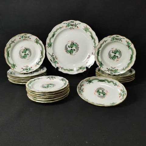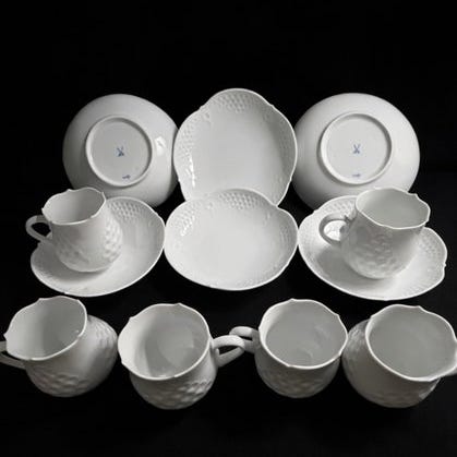 24-delt spiseservice til 6-7 personer fra det kendte porcelænsfirma Meissen. 1.-4. kvalitet. Form: Wellenspiel Relief. Skærbensfarve hvid. Meget god stand, små chips på 3 tallerkener. Blå underglasur sværdemærke. Mikrobølgeovn-sikret.