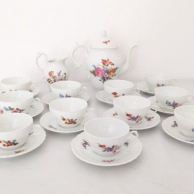 12-personers te- eller kaffesæt fra den berømte produktion Richard Ginori. Sættet består af 12 små kopper med underkopper, tekanden med låg, sukkerkanden med låg og mælkekanden. Den tynde, men holdbare porcelæn har klassiske og eleganteFormer. Dekorationerne er i guld som profilen, livlige og i perfekt stand. Vintage-status er fremragende.