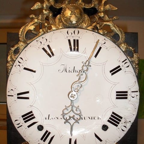 Comtoise-ure signeret omkring 1850, Frankrig, i god stand med let aldersslitage; mekanisk værk med 8-dages gangreserve og klang hver halve time ved en bronze klokke; bemærk: balancer og vægt mangler