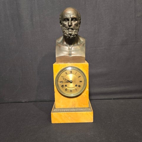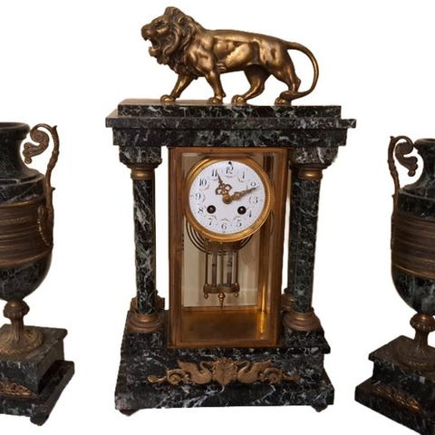 Antikt fransk klokkesæt med marmor og forgyldt bronze i antik stil, dateret til 1850–1900, mekanisk 8-dages urværk, tre dele i sættet, mål 42 × 23 × 11 cm, vægt 10 kg, med opslået nøgle, halvtime slag med klokке, i god brugt stand med mindre aldersrelaterede tegn; pendul skal justeres. Klik på den blå "gå til varen" knap, for at købe eller byde på denne vare. Den samlede pris vil blive vist inden du afgiver dit bud.