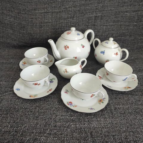 Velkommen! Vi præsenterer tekanden med kopper og underkopper i gyldent blomster-mønster
