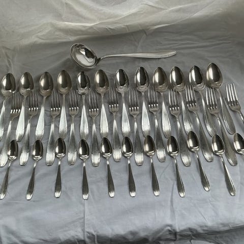 Et sæt på 24 Christofle-objekter. 6 spiseskeer, 6 dessertskeer, 6 escargot-gaffler, 3 escargot-tænger, ske og gaffel i æske, flaskeåbner med hoved af den romerske kejser. Alt mærket "Christofle" per stykke. Samlet vægt uden æsker: 1144 gram. I god stand med brugsspor. Ikke restaureret.