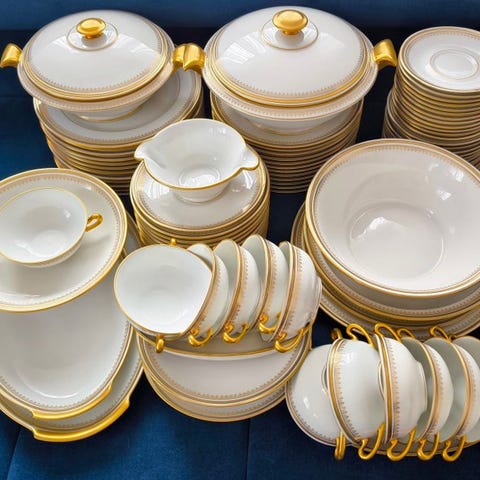 12-delt service i Limoges porcelæn af håndværkskunstnerne Nath & Cath. Håndmalet med guldtråd.