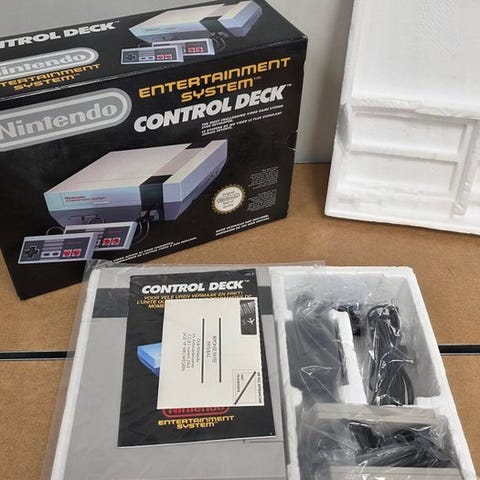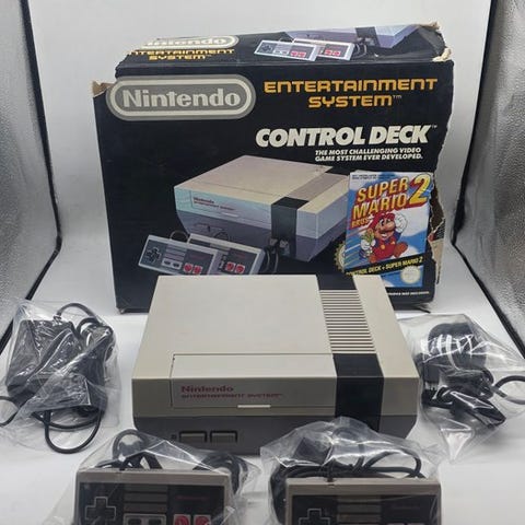 Nintendo NES i original æske, PAL 1985 FRA-udgave, med 2 controllere og Mario Bros 3- cartridge; testet og fungerer, med originalt strømforsyning og kabler. Klik på den blå "gå til varen" knap, for at købe eller byde på denne vare. Den samlede pris vil blive vist inden du afgiver dit bud.