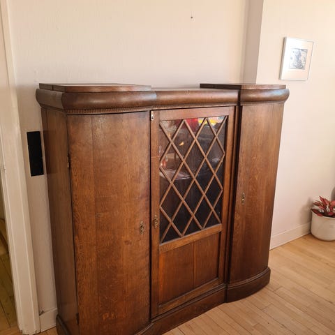 Et gammelt gammelt tungt skab i moseeg, med aldersrelaterede spor sælges.