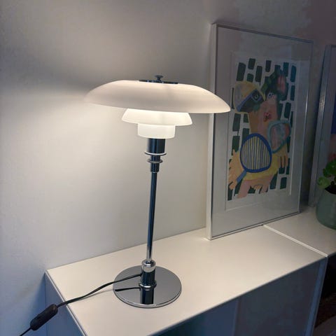 PH 3/2 bordlampe sort forkromet i pæn og velholdt stand med minimale brugsspor med opalglas uden fejl.