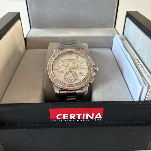 Certina dameur i rustfrit stål med tofarvet lænke i stål og guldfarvet belægning. Uret har rund hvid urskive og tre små hjælpeskiver samt datovisning kl. 12. Kronografknapper og krone er placeret i højre side af urkassen. Egnet som armbåndsur til kvinder til daglig brug eller mere formelle anledninger.
