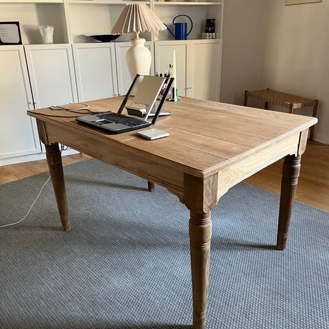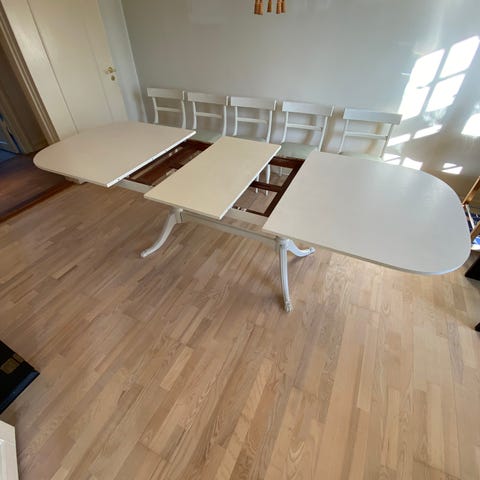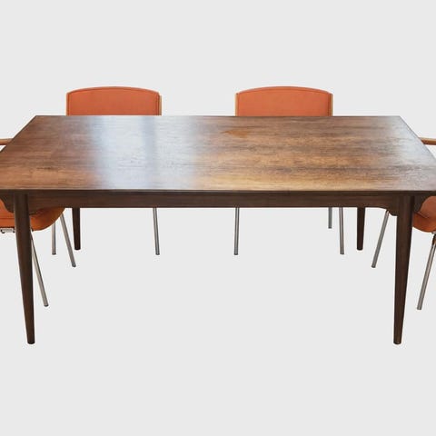 Gammel&Tradition spisebord i træ . Rektangulær bordplade med afrundede hjørner og mørk træfinish. Bordet står på en todelt sokkel med tværgående støtte, som giver stabilitet. Velegnet som spisebord eller arbejdsbord i spiseområde, køkken eller stue. højden 75 cm høj og bredden 73 CM og total længde med de to udfoldendeplader 141 CM og uden de to plader slået ned er den 93cm lang