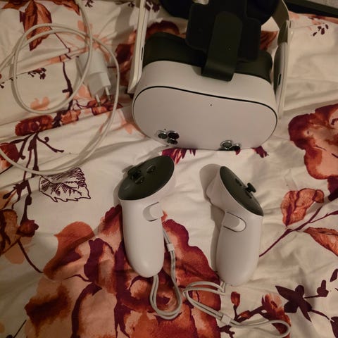 Headsettet har justerbar hovedrem og er trådløst i brug. Controllere har sorte frontpaneler med knapper og styrepinde.
