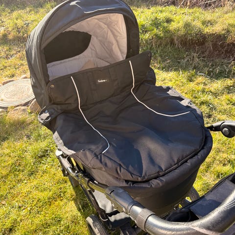 Flot stor sort big star supreme barnevogn med masser af tilbehør, bæresele med nyfødt indsats, cybex autostol, hvid slynge vugge med ophæng til dørkarm, ammepude, matchende pusletaske, kæmpe solskyggeskærm i sort.