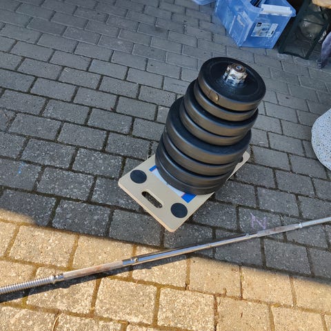 Vægtstang og plader, samlet 40 kg. Med klemmer, underlag og medicin bold.