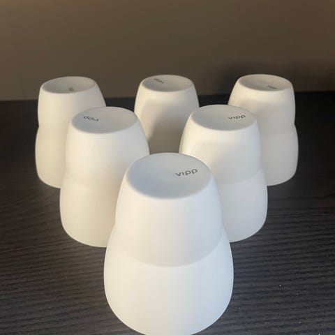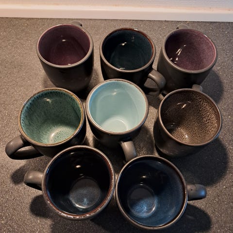2 af espressokopperne har lidt misfarvning i bunden, kan måske fjernes med eddike. De er brugte.