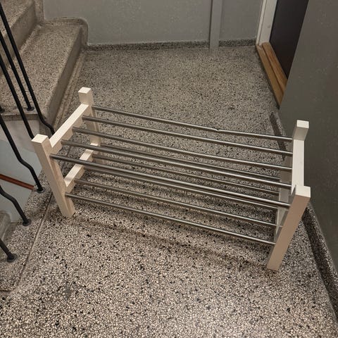 IKEA skoreol i hvid med metalstænger. Reolen har flere hylder med parallelle metalrør, som giver god ventilation omkring skoene. Stellet er i hvidt materiale, og konstruktionen er åben, så skoreolen er velegnet til placering i entré, garderobe eller bryggers til opbevaring af sko og mindre genstande.