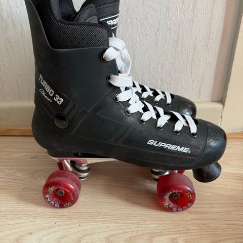 Supreme Turbo 33 rulleskøjter i størrelse 41. Klassiske side-by-side rulleskøjter med sort støvle og hvide snørebånd. Monteret på metalstel med fire hjul på hver skøjte. Egnet til rulleskøjteløb på glatte underlag som fx asfalt eller indendørs gulve.