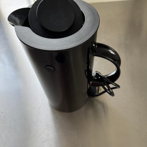 Stelton elkedel i hvid farve. Elkedlen har et enkelt, cylindrisk design med hank og låg i kontrastfarve. Den tilsluttes med almindelig stikprop til stikkontakt.