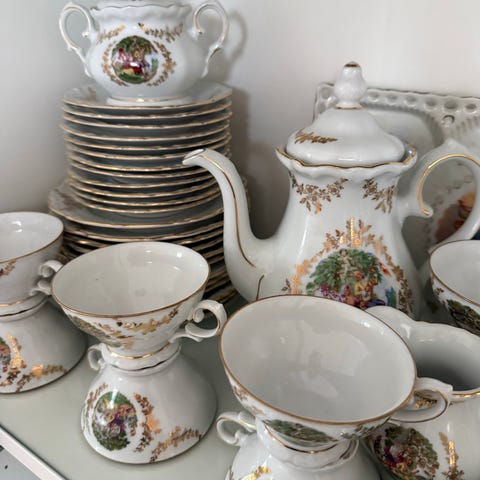 Anders Petter kaffestel i guldporcelæn. Sættet består af kaffekande, flødekande, kopper og underkopper med dekorationer på siden. Velegnet til servering af kaffe eller te. Stellet er fremstillet i porcelæn med gylden overflade og motivdekoration.
