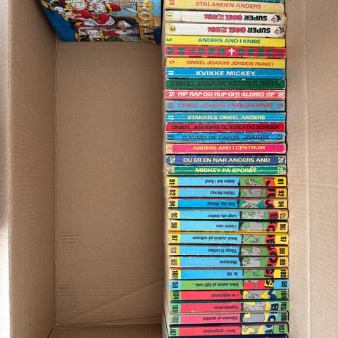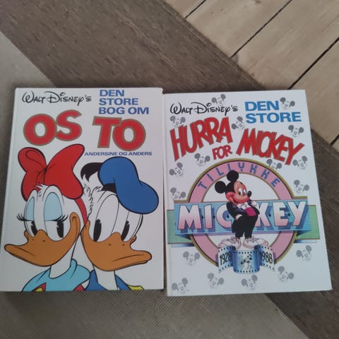 Walt Disney Den Store Mickey Mouse bogsamling. Samling af hardback-bøger med Disney-tegneserier og illustrationer, herunder titler fra serien "Den Store Mickey Mouse" og beslægtede Disney-udgivelser. Bøgerne har illustrerede rygge med forskellige Disney-figurer og er velegnede til læsning og som samlerobjekter for Disney-interesserede.