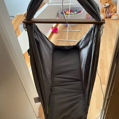 Slyngevugge med motor. Fungerer upåklageligt og har givet mange gode lurer. Kan både sættes op med krog i loftet eller fjeder til dørkarme. Madras til nyfødte og en lidt fastere madras til lidt større børn medfølger. Fra dyre- og røgfrit hjem.