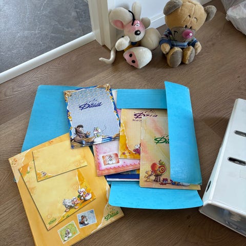 Diddl brevpapir og kuverter med forskellige motiver i flere farver. Sættet indeholder ark i forskellige størrelser samt matchende små sedler og kuverter med Diddl-figurer og andre tegninger. Mange forskellige stande. Er sat i brugt da der er lidt buk på nogen af papirende