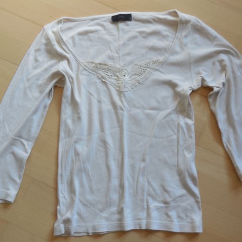Bluse i mørk beige, samt i meget tyndt stof med elastik fornede i ærmerne. Måske silke i den firkantede krave.