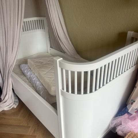 Pæn Sebra Junior & grow seng. Kun normale brugstegn fx inden i, hvor man trækker sengen ud og ind.