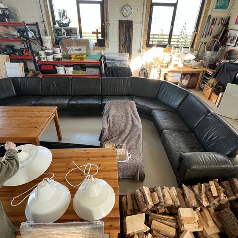Vi sælger vores store dejlige sofa med puf. Sofaen kan også slåes ud til en seng. Den skal bæres ned (i dele) fra anden sal. Vi skal bare af med den.