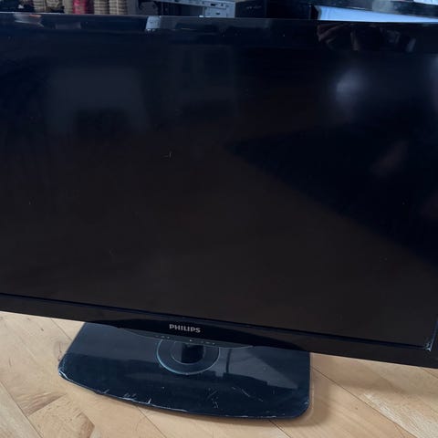 32 tommer tv i hvid farve. Fladskærm med tilhørende fjernbetjening og strømforsyning som vist på billederne. Fungerer perfekt.