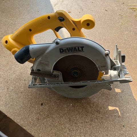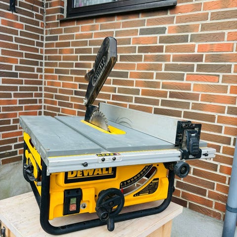 DeWalt bordrundsav på stativ. Savbord i metal med integreret rundsavklinge og justerbar parallelanslag. Monteret på firebenet stativ for stabilitet under arbejde. Egnet til præcisionsskæring af træ og pladematerialer i værksted eller på byggeplads. Drift via netkabel.