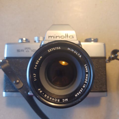 Minolta SR-1 spejlreflekskamera med udskifteligt objektiv. Kameraet er et analogt 35mm SLR-hus i metal med mekaniske indstillinger for lukkertid og blænde via objektivet. Ingen lysmåler.