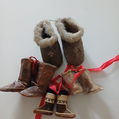 Skindluffer og kamikker af sælskind fra Grønland samt lille pyntekamik. Grølandske perlebroderier.