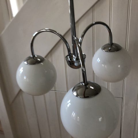 IKEA lysekrone med flere arme og hvide glas-skærme. Lampen er udført i hvidt metal med buede arme og cylinderformede fatninger, hvorpå der monteres små, opale glas-skærme. Velegnet som loftlampe i stue, spisestue eller større rum, hvor der ønskes belysning fra flere lyskilder fordelt i rummet. Bruges med standardpærer, som monteres i hver enkelt fatning under glas-skærmene.