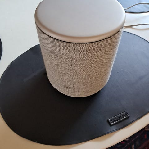 Bang & Olufsen radio M5 i cylindrisk design med lys grå stofbeklædning og lys topplade.