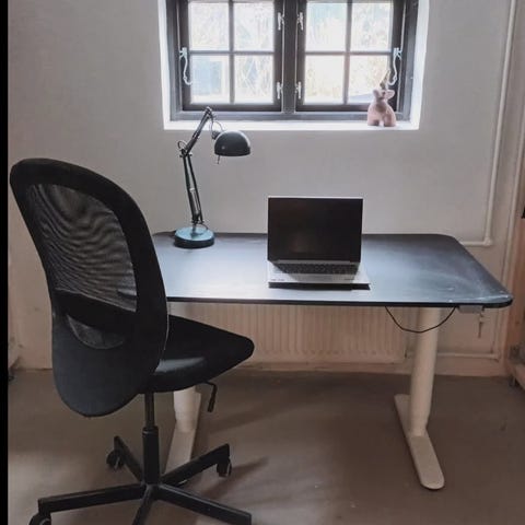 Skrivebord med el-hæve/sænke funktion og kontorstol i sort