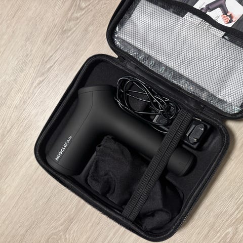 Recoverym8 massagepistol. Elektrisk massageapparat til muskelafspænding og restitution. Håndholdt model med genopladeligt batteri og flere intensitetsniveauer, egnet til brug på forskellige muskelgrupper.