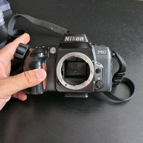 Nikon F55 med Nikkor 28-80 mm zoom. Analogt spejlreflekskamera. Kameraet bruger film og har udskiftelig objektivfatning, så der kan monteres forskellige Nikon-objektiver efter behov. Velegnet til fotografering på film med manuelle og halvautomatiske indstillinger afhængigt af objektiv og kamerahusets funktioner. Kameraet har indbygget søger, topdisplay og remfæste til bærestrop.