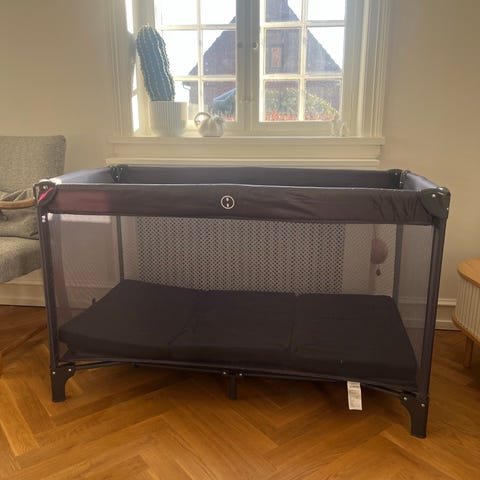 Voksi rejseseng i grøn farve. Rejsesengen har bærehanke, polstret kant og madras med lyst betræk med små mønstre. Egnet til spædbørn og mindre børn som transportabel sove- og hvileplads der kan bruges både hjemme og på farten, fx i sofa, seng eller på gulv. Materialer fremstår som tekstil med blød polstring. Velegnet til brug i barnevogn eller som ekstra liggeplads på rejser.