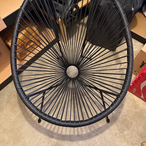 Papasan stol med rundt metalstel og løs, tyk pude i cremefarvet tekstil. Stolen har skålformet sæde, som giver en dyb siddekomfort. Stellet er udført i metal med åben trådkonstruktion. Egnet som loungestol i stue, værelse eller udestue.
