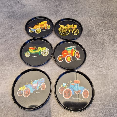 Består af rund lakæske indeholdende 6 små glasbrikker/bordskånere beregnet til drikkeglas.