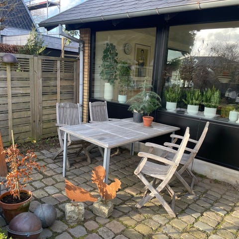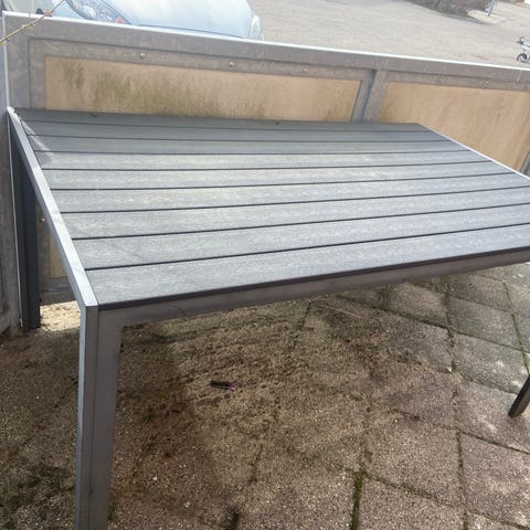 Havebord og stole i hvidmalet træ. Stolene kan klappes sammen. Sættet består af et rektangulært bord med lameller, fire stole med armlæn og to uden armlæn. Bordpladen er i træ med skibsdæk udseende , mens stel og stole er malet hvide. Stolene kan klappes sammen.
