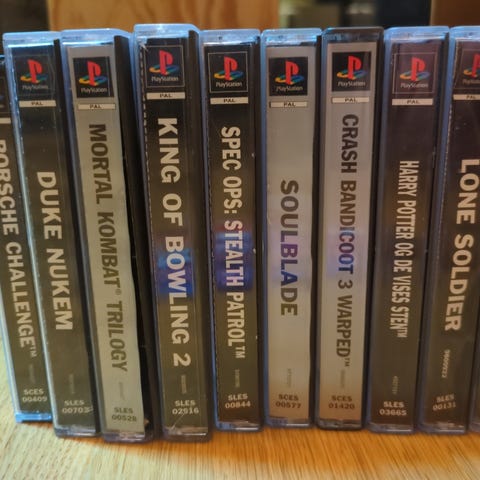 Sony PlayStation spilpakke med 6 originale spil i cd-covere.