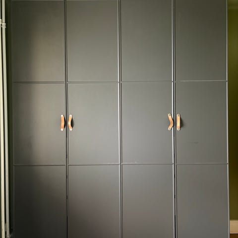 Sælger dette stilrene IKEA PAX garderobeskab med masser af praktisk opbevaring. Skabet har den populære grågrønne låge, som giver et roligt og moderne udtryk til soveværelset.