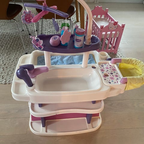 Pusle-/ badebord fra Bebellino med diverse tilbehør og dukke sælges.
