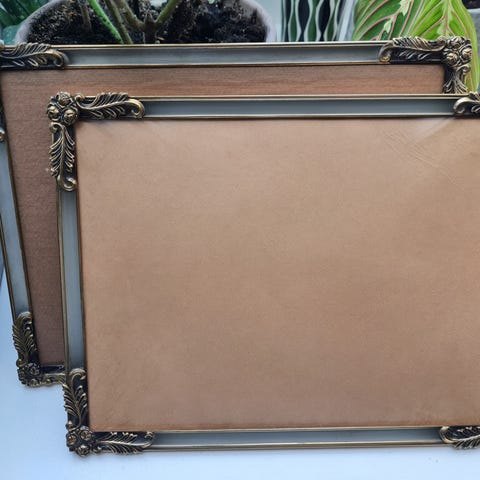 Retro/vintage/antikke whitewashed/gyldne rammer med buet glas og med støttefod der kan drejes efter om rammen ønskes vandret eller lodret.