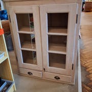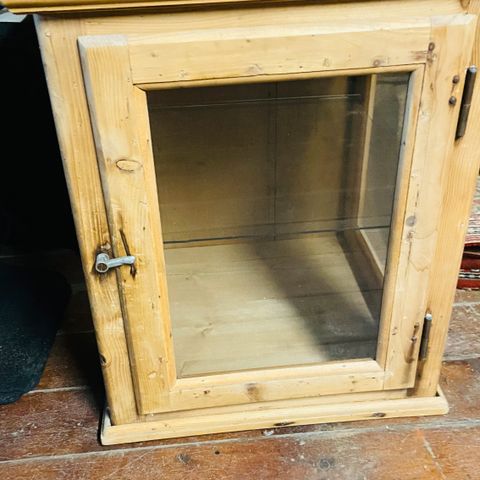 Pæne fyrretræs vitrine skab med glaslåger.
